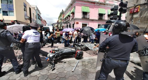 Afuera del Palacio Legislativo inconformes con las reformas constitucionales rompieron un cerco de policías que intentó evitar que llegaran a las puertas del Congreso: los inconformes lo rompieron y golpearon la puerta principal del Congreso.