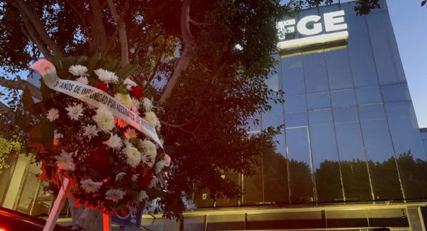 Con una corona fúnebre encabezando la movilización, llegaron hasta la Fiscalía General del Estado (FGE), donde dejaron también las cartulinas con las que exigían justicia plena.