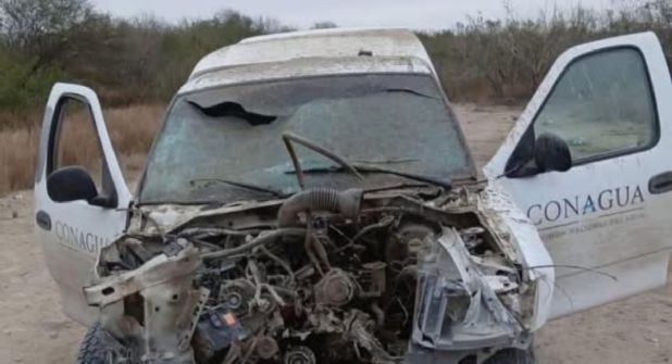 El vehículo, identificado con el logotipo de la Comisión Nacional del Agua, quedó prácticamente inservible.