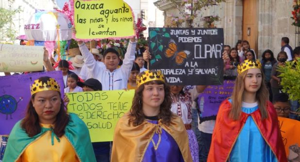 A iniciativa del Centro Calpulli A.C. que promueve los derechos de la niñez y adolescencia en Oaxaca, las reinas magas encabezaron una calenda que salió de Santo Domingo de Guzmán, recorrió el andador turístico y llegó al zócalo capitalino en donde también destacaron la situación de pobreza que viven más de 900 mil niñas, niños y adolescentes en el estado de Oaxaca, infancias que no tienen acceso a lo más básico para su superviviencia.