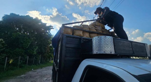 Durante la inspección, los agentes encontraron en el área de carga diversos paquetes envueltos en cinta café que contenían un total de 300 kilos de marihuana.