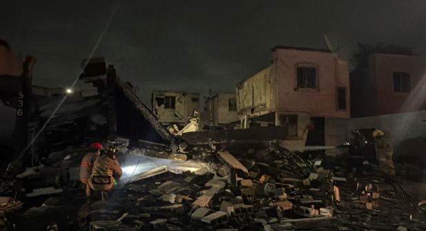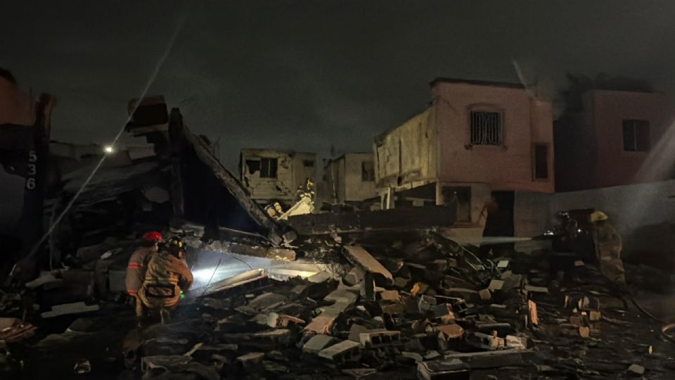 Este sábado, Protección Civil de Nuevo León, con apoyo de binomios caninos de PCNL, Fuerza Civil y la Fiscalía, realizan labores de búsqueda entre los restos de la vivienda.