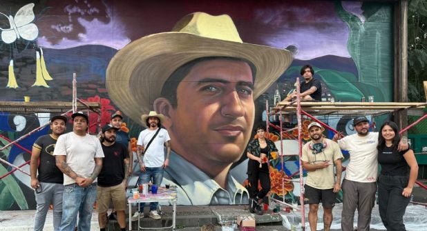 El joven, explicó que para este muro se inspiraron en la figura de Manzo, lo que rodea el rostro con el sombrero es un listón con su nombre, el año de nacimiento, el año de muerte y las flores de cempasúchil, que representan la fecha de su muerte (1 de noviembre)”, contó.