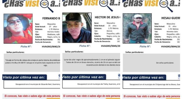Fuentes de seguridad indicaron que se trata de los hombres que contaban con ficha de búsqueda. Ellos son: Fernando Bello Barrera, de 27 años, desaparecido en Eduardo Neri; Hesau Guerrero Sánchez, de 35 años, desaparecido en Chilpancingo; y Héctor Jesús Cabrera Morales, de 23 años, desaparecido en Tixtla. Según los datos de las fichas de búsqueda, los tres fueron vistos por última vez el pasado 18 de este mes.
