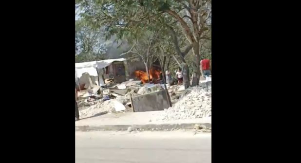 En otro momento del video, se observa cómo prenden fuego a una de las viviendas, que está construida con tablas de madera y plástico. Se escuchan gritos de desesperación, señalando que en las casas aún hay personas dentro, incluidos niños, a quienes se les ve salir de la zona.
