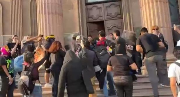 Después de ello enfilaron a la Explanada de Los Héroes en la Gran Plaza, frente al palacio estatal de gobierno donde lanzaron consignas al gobernador Samuel García, realizaron algunas pintas entre ellas a un lactario, para posteriormente insultar a los policías lo que desató los empujones y un zafarrancho.
