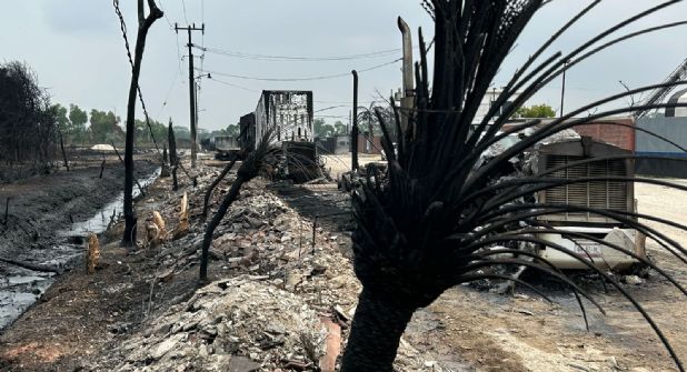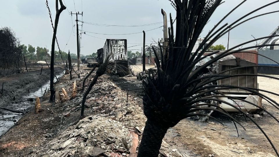 Durante un recorrido realizado este lunes, se observaron fierros retorcidos de maquinaria calcinada, una oficina totalmente destruida por las llamas, restos humeantes y un drenaje lleno de una sustancia viscosa negra, junto a un fuerte olor a hidrocarburo quemado. El paisaje era de completa devastación.