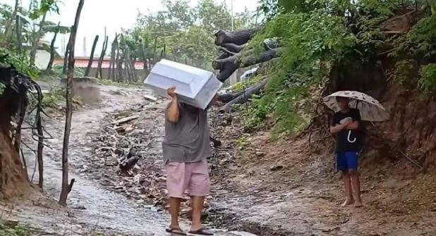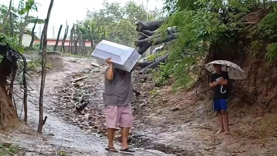 Un hombre carga el ataúd con el cuerpo del niño de un año que murió ahogado tras ser arrastrado por la corriente de un río en San Marcos, Guerrero, durante las lluvias provocadas por el huracán Erick. Créditos: Especial