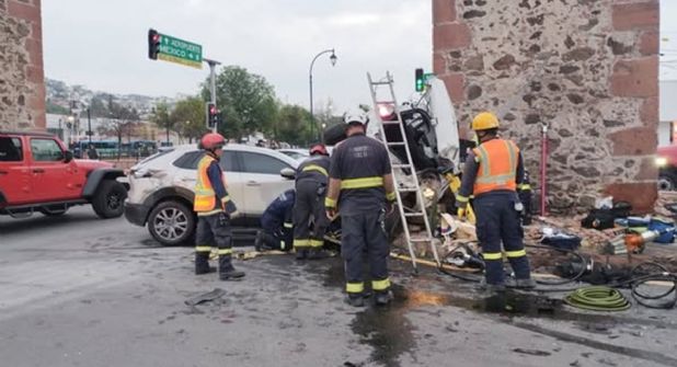 De acuerdo con autoridades, la conductora de un vehículo Mazda que circulaba sobre Calzada de los Arcos ignoró la luz roja del semáforo e impactó a dos vehículos que transitaban sobre Bernardo Quintana. Uno de los automóviles fue proyectado contra la estructura de un arco, lo que provocó que volcara y quedara prácticamente destruido.