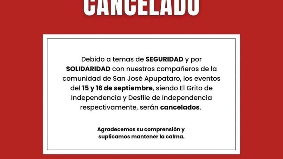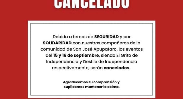 “Debido a inquietudes de seguridad y en solidaridad con nuestros vecinos de San José Apupataro, hemos tomado la difícil decisión de cancelar los festejos patrios del 15 y 16 de septiembre. Esto incluye la ceremonia del Grito de Independencia y el Desfile de Independencia”.