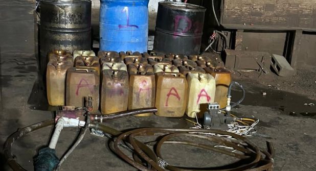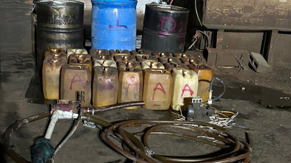 Durante el operativo, las autoridades localizaron un contenedor de 200 litros que contenía 40 litros de aparente hidrocarburo, así como 26 bidones vacíos de 20 litros de capacidad, dos bombas hidráulicas, tres mangueras conectadas a dichas bombas y dos contenedores adicionales de 200 litros de capacidad.