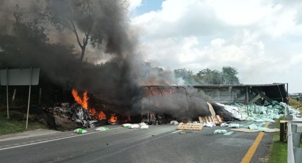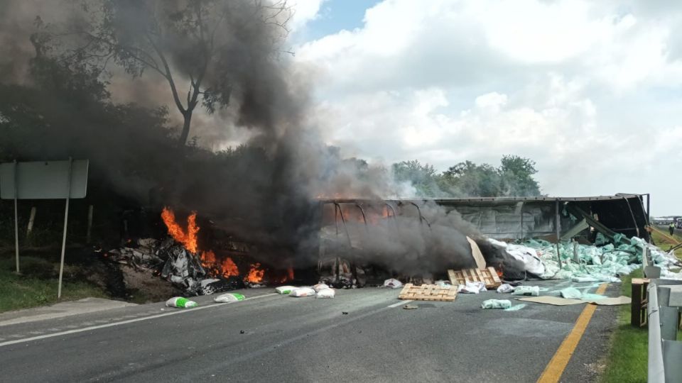 Un tráiler que transportaba fertilizantes volcó y se incendió mientras circulaba por la carretera Tampico-Mante a la altura de Altamira en Tamaulipas, la tarde de este viernes 26 de septiembre. De acuerdo con información preliminar.