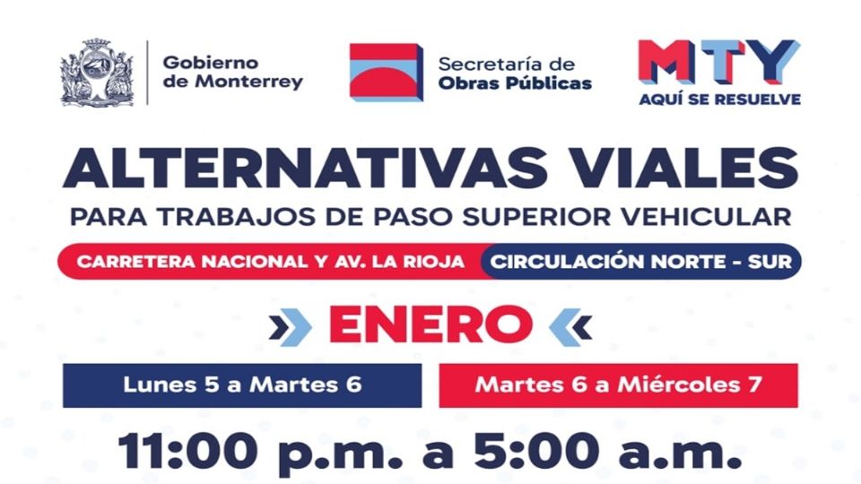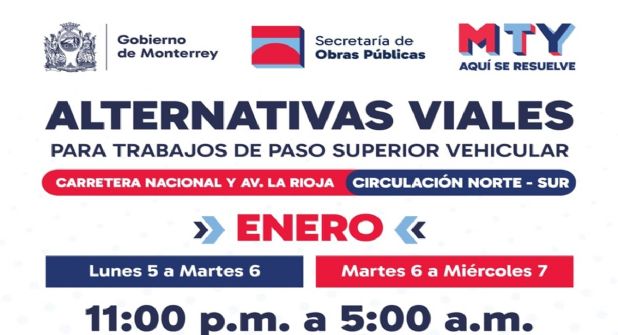 MONTERREY.- Para continuar con la construcción del Circuito Vial Huajuco, este lunes 5 y martes 6 de enero se aplicarán durante la noche, restricciones viales en la Carretera Nacional a la altura de La Rioja.