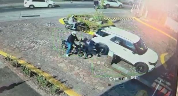 En un video de vigilancia, quedó evidenciado el momento en el que dos sujetos en motocicleta, seguían a corta distancia la camioneta de lujo en la que viajaba el empresario aguacatero acompañado de sus escoltas.