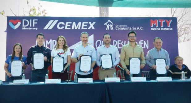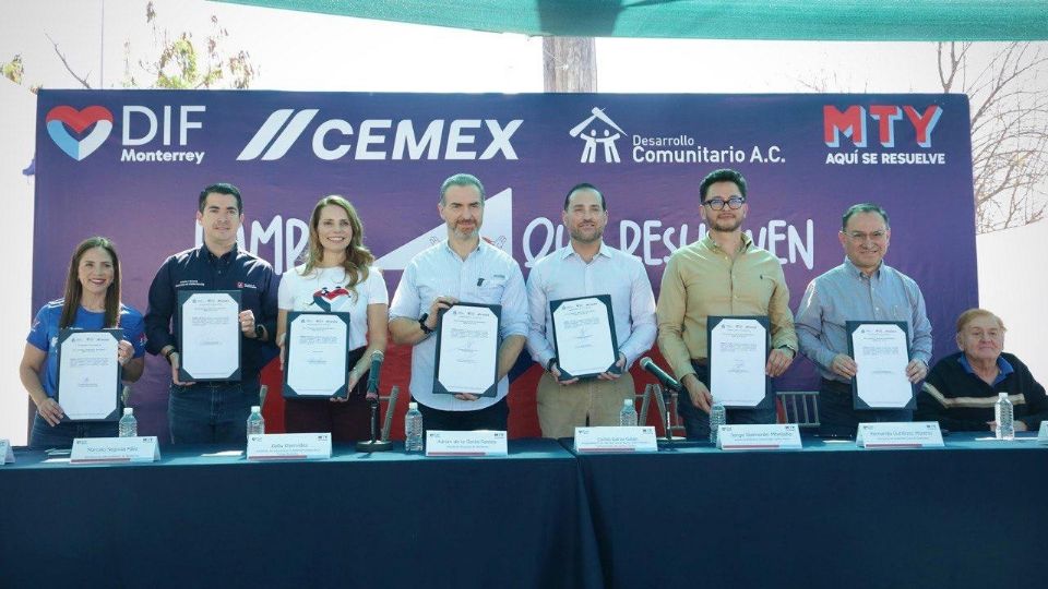 El alcalde Adrián de la Garza y la presidente del DIF Monterrey, junto con Carlos Garza Galán, vicepresidente de Asuntos Corporativos, Sostenibilidad y Comunicación y la Asociación Civil Desarrollo Comunitario, firmaron un convenio de colaboración para promover el desarrollo ordenado, sustentable y sostenible de las comunidades en situación de vulnerabilidad.