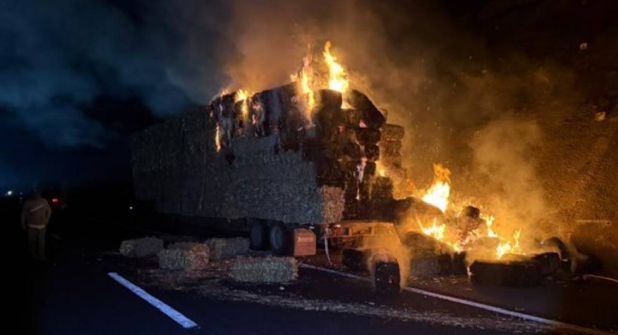 Guardia Nacional Carreteras informa que hay cierre total a la circulación en Veracruz por choque e incendio de tractocamión que transportaba paja.