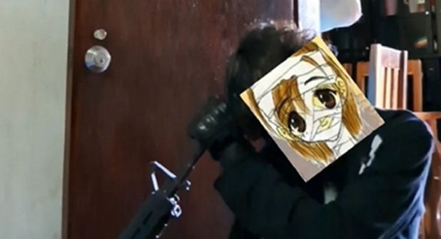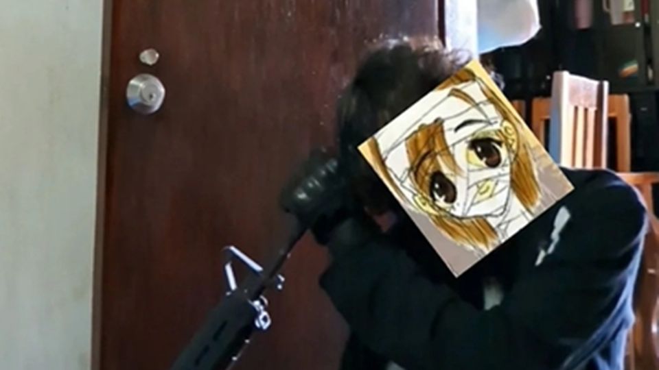 En otro video se ve al adolescente en cuclillas con el arma calibre 5.56 y el rostro oculto con un dibujo. El arma tiene el cargador puesto en su lugar.