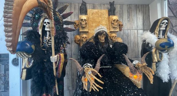 La calavera está adornada de un vestido de amplia falda, color azul marino, de brillantes; la ornamentación de su silla: los huesos de los brazos de la calavera, las muñecos, descansan en dos cráneos con cuernos que brillan con luces por dentro.