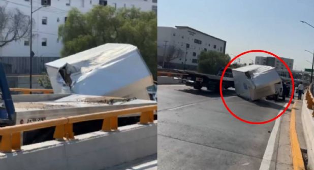 La unidad quedó unos cuantos metros después del arco, ya que la caja se desprendió, quedó volteando hacia el lado contrario de la cabina y tirada sobre el asfalto, además, un automóvil que venía detrás de la camioneta también resultó dañado, pues la caja lo alcanzó a golpear.