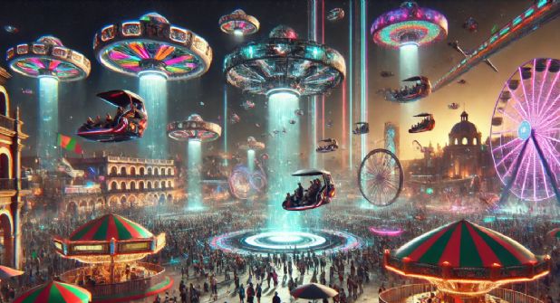 Los juegos mecánicos son el alma de la feria, y en 2050, han alcanzado un nivel impresionante. Carruseles que flotan en el aire giran suavemente, mientras las sillas voladoras no solo giran, sino que también se elevan hasta 30 metros para ofrecer vistas panorámicas de la ciudad. Las montañas rusas ya no requieren rieles; ahora son cápsulas propulsadas por energía cinética que desafían la gravedad. A cada paso, robots humanoides se aseguran de que la experiencia sea segura y fluida, gestionando filas y ayudando a los visitantes.