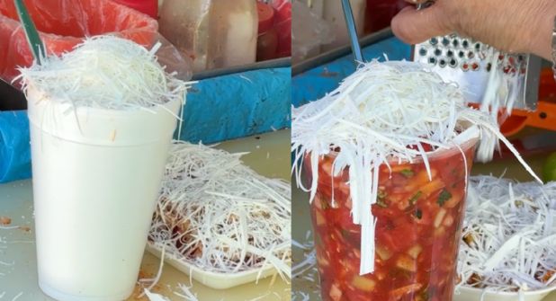 En León, no se trata solo de economía. Se trata de costumbre. Este “queso” se ha vuelto sinónimo de frescura, de calle y de sabor. En puestos como Jicamas Gus, uno de los más populares de la ciudad, el queso de plástico corona los vasos de fruta con una capa generosa y esponjosa. Lo rallan finísimo para que se funda con el chamoy, el chilito y el limón.