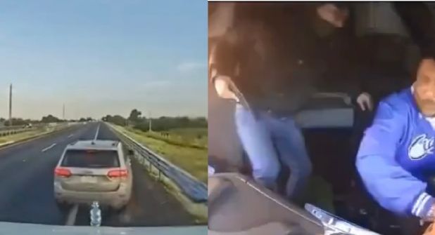 Dos de los delincuentes sacaron la mitad de sus cuerpos por la ventana para disparar al transportista, este se trata de cubrir agachando la cabeza detrás del volante. Jalaron del gatillo y las ráfagas centellearon en la grabación.