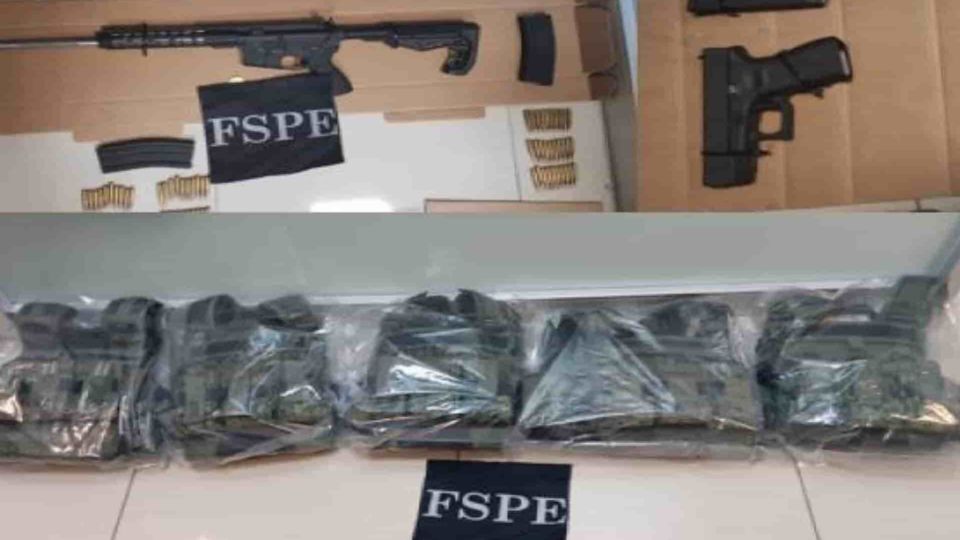 Armas y cartuchos: • 01 arma de fuego larga, calibre .223. • 01 arma de fuego larga, calibre .223. • 01 arma de fuego larga, calibre .223. • 01 arma escuadra calibre 9 mm. • 205 cartuchos calibre .223. • 15 cartuchos calibre 9mm. • 08 cargadores calibre .223 mm • 01 cargador calibre 9 mm.