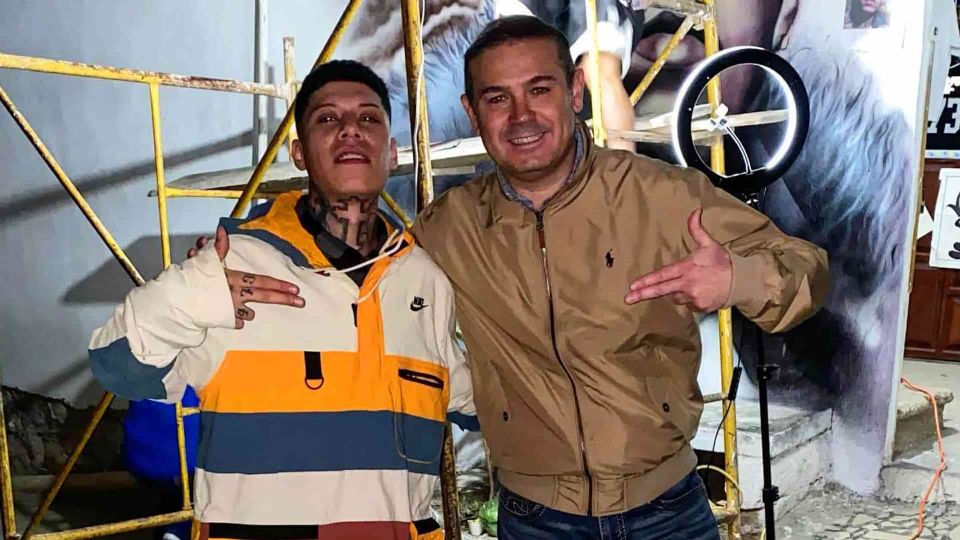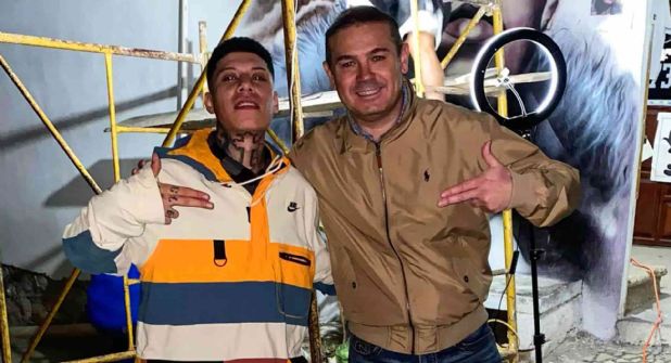 El rapero se tomó una fotografía con el alcalde Alejandro Navarro, ambos hicieron una señal callejera y de fondo se ve el rostro pintado de Santa Fe, al parecer sus mismos colegas trabajan en el mural.