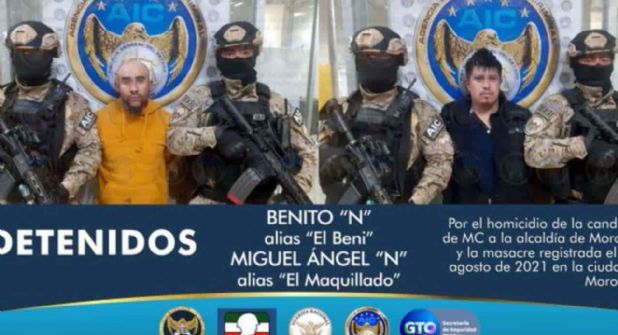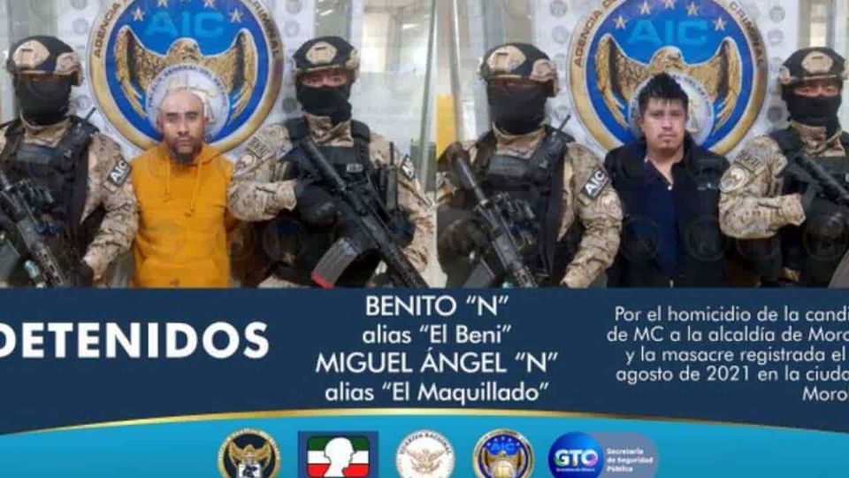 La @FGEGUANAJUATO a través de la @AIC_Guanajuato y en coordinación con @SeguridadGto, @SEDENAmx, @GN_MEXICO_ han logrado la detención de Benito N y Miguel Ángel N, con ord. de aprehensión por homicidio de la candidata de MC en Moroleón y multihomicidio en un bar de esa ciudad. pic.twitter.com/ILQDlF3hgK