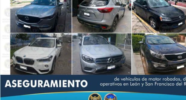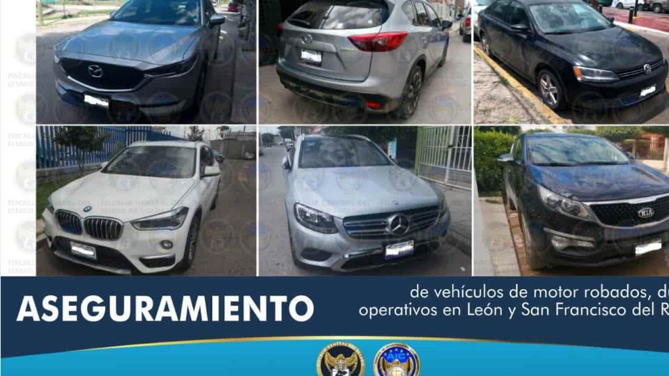 a Fiscalía General del Estado (FGE), en seguimiento a investigaciones en torno al robo de vehículos, realizó operativos en las ciudades de León y San Francisco del Rincón, con resultados positivos para el aseguramiento de seis unidades de modelo reciente, algunos de ellos de lujo.