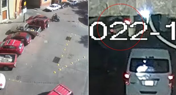 Posteriormente otra cámara grabó el rápido momento en que el motociclista se impacta contra el lado del copiloto del automóvil Atos y por el fuerte impacto lo volcó proyectándolo contra uno de los muros del túnel, cerca de calle subterránea bajo la Plaza de los Ángeles, en el Centro Histórico de la ciudad de Guanajuato.