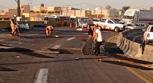 Silao.- A lo largo de un centenar de metros quedaron dispersas las rejillas metálicas que transportaba un tráiler sobre la carretera federal 45 León-Silao, congestionando en tránsito durante un par de horas.