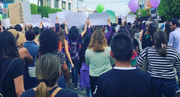 Las manifestantes, que llevaban cartulinas y distintivos verdes de la lucha feminista y otros morados, caminaron por la avenida Guerrero para llegar por la avenida Revolución al centro de la ciudad a la plaza principal.