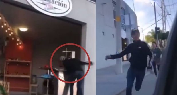 En el video que postearon en redes sociales presumiendo sus acciones se ve a un joven vestido con ropa oscura y gorra que sigilosamente se acerca a la taquería. Esconde la mitad de su cuerpo detrás de un muro mientras se sostiene con los brazos para estirar el cuello hacia el trompo.