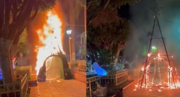 El hecho fue grabado en videos y difundido en redes sociales en los que se escucha la sorpresa de habitantes del lugar que observan cómo el fuego consume en su totalidad el árbol de Navidad.