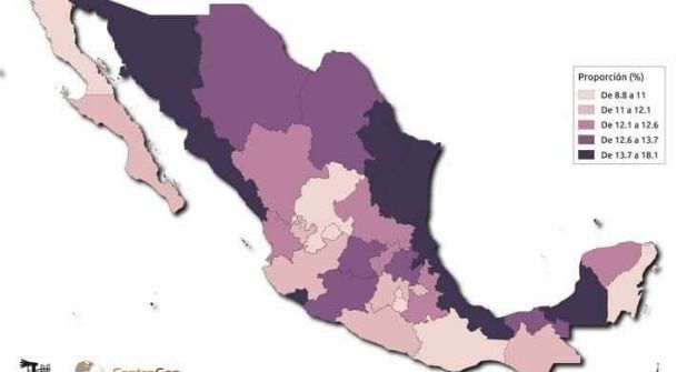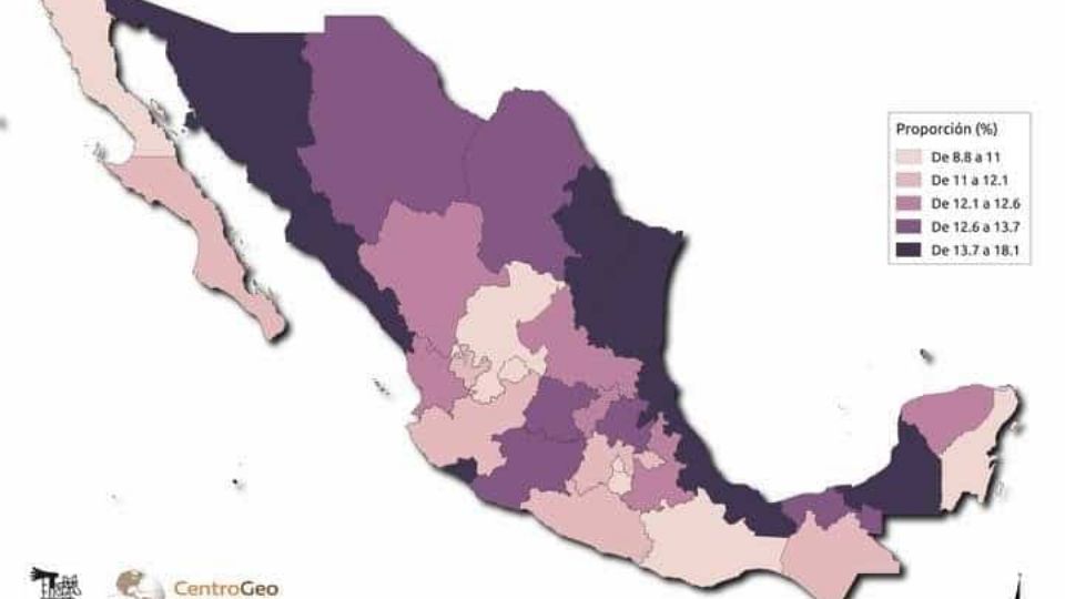 En segundo lugar, están Chihuaha, Zaragoza, Michoacán, Guanajuato, Hidalgo y Tabasco con una proporción del 12.6% al 13.7%. Después aparecen Durango, Nayarit, San Luis Potosí, Querétaro y Puebla con números del 12.1% al 12.6%.