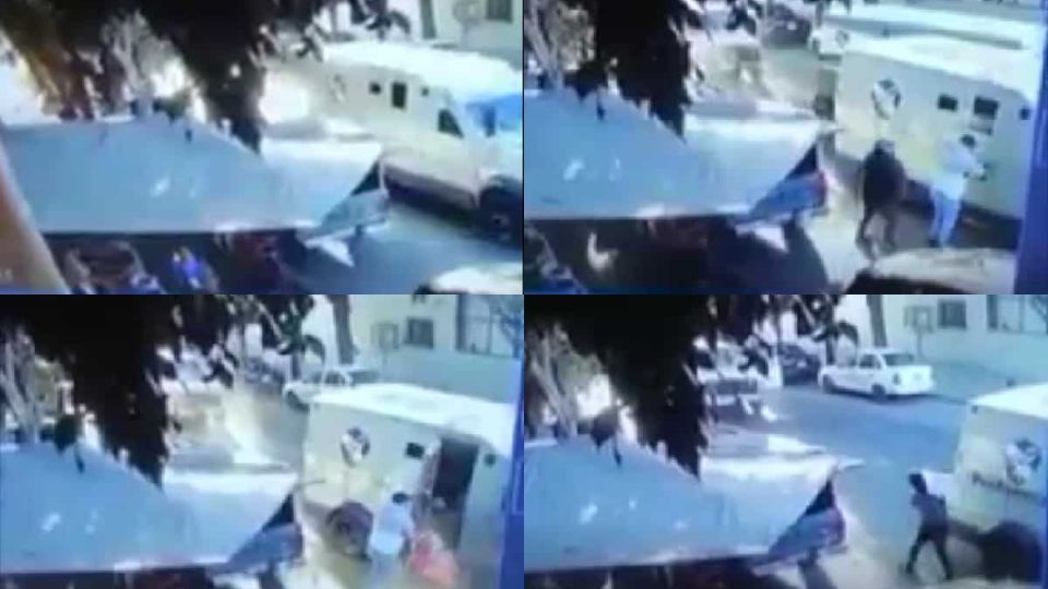 Momentos después uno de ellos es impactado por la parte trasera y la otra en la parte del frente y en los custodios repelen la agresión armada y se ve que dos de los delincuentes abren la puerta del camión de valores con facilidad, al parecer con una llave y sacan bolsas con dinero.