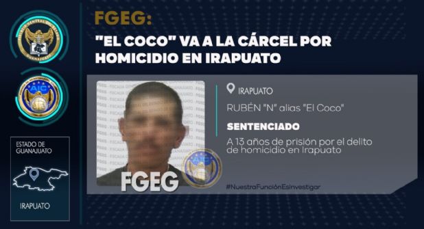 Irapuato.- El 20 de noviembre de 2020, Rubén, alias "El Coco", cumplió la orden de una persona que aún no ha sido identificada, emparejó su motocicleta a un triciclo donde su víctima se ganaba la vida vendiendo tacos y con el arma de fuego que portaba lo asesinó a balazos. Este sábado recibió por parte de un juez la sentencia de 13 años de prisión por el delito de homicidio.