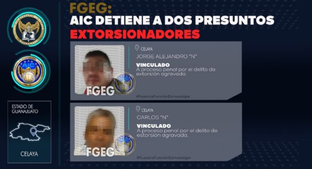 Celaya.- Dos presuntos extorsionadores fueron detenidos por agentes de la Fiscalía General del Estado el pasado 18 de agosto en Celaya en el preciso momento en que cobraban "la cuota" a su víctima, por lo que fueron presentados ante un juez que les decretó vinculación a proceso y ahora se encuentran en prisión preventiva en espera de una sentencia.