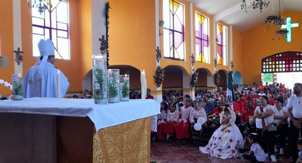 Ahora, Víctor Alejandro Aguilar Ledesma, obispo de Celaya desde hace poco más de un año, acudió a la comunidad para encabezar la misa conmemorativa. El templo estuvo pletórico, bancas llenas al igual que los pasillos, y gente todavía en la calle.