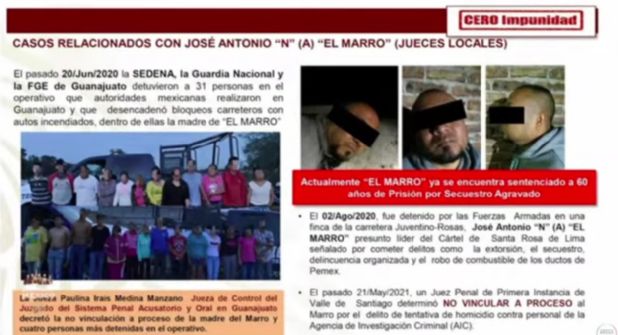 El subsecretario federal mencionó que en mayo de 2020, autoridades estatales y federales capturaron a 31 personas integrantes del mismo cártel del Marro, por haber realizado bloqueos carreteros y quema de vehículos en varios puntos del estado. Y sin embargo, al llegar ante los juzgados fueron puestos en libertad. No hubo prisión preventiva oficiosa y salieron a las calles a continuar delinquiendo.