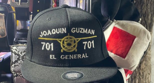 En una de las gorras se enmarca el nombre de Joaquín Guzmán, bordado con letras blanca, abajo una avioneta en color dorado al final dice “El general”. Este y otros objetos como cintos en los que en la hebilla se muestran hojas de cannabis, otros con dos rifles cruzados con A-K47 son vistos en la una ciudad colonial icónica en la cultura de México y el mundo.
