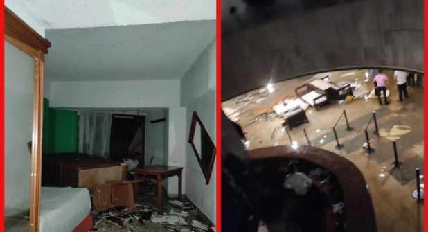 En las fotos compartidas por la joven a este medio, se puede observar la destrucción en el hotel. Muebles tirados, escombros del techo en el suelo, vidrios y espejos rotos, agua en el lobby, papeles nadando y cables cerca del agua.