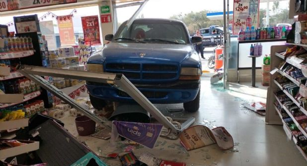 Una mitad de la camioneta quedó adentro de la tienda ubicada en Ex Hacienda de Cuevas de esta ciudad capital, derribando las puertas de acceso y uno de los estantes.
