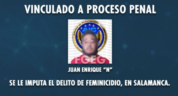 Tras ser llevado ante la autoridad jurisdiccional, la Fiscalía del Estado formuló imputación por el delito de feminicidio, en contra de Juan Enrique, a lo que el juez dictó auto de vinculación a proceso penal, mientras espera sentencia por sus actos criminales.