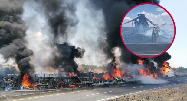 Hasta las 18:30 horas de este miércoles 21 de junio, los cuerpos de rescate seguían combatiendo el fuego que carbonizó los vehículos y la carretera permanecía cerrada.