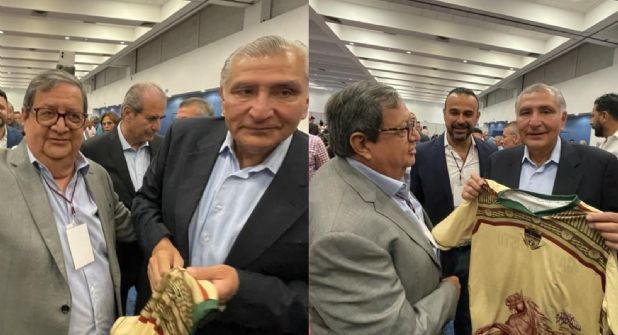 Una vez cerca del ex secretario de Gobernación, le entregó una camiseta del nuevo equipo del que es propietario y posó sonriente con él. ¿Que hacia Zermeño en un evento de la 4T? El actual dueño de Los Alacranes de Durango se está acercando a Adán Augusto y dijo ser simpatizante del candidato.