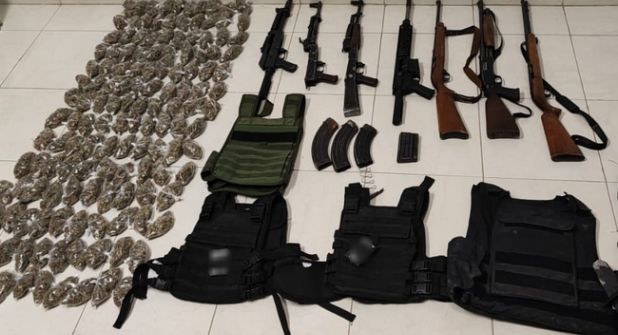 Durante la revisión a los automotores localizaron lo siguiente: 7 armas largas; 3 cargadores; 140 bolsas de marihuana.