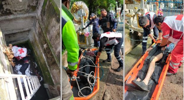 Una persona que acudió al cementerio para visitar la sepultura de uno de sus familiares alcanzó a escuchar los gritos del hombre quejándose desde el fondo de la tumba. Entre miedo y curiosidad, el visitante se abstuvo de salir corriendo y dominaron las ganas de ir a ver lo que ocurría. Era el adulto mayor, que pedía ayuda y se quejaba de fuertes dolores.