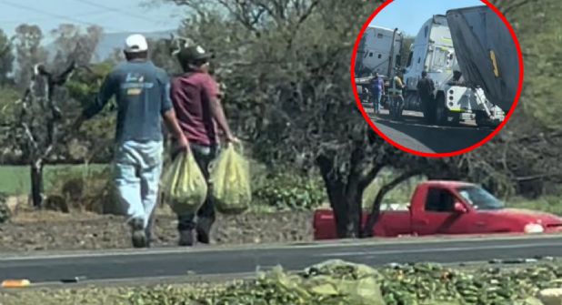 Salamanca, Guanajuato.- El conductor de un tráiler que transportaba chiles jalapeños sufrió un aparatoso accidente sobre la carretera Salamanca – Celaya. El percance vial provocó que el cargamento cayera a la vialidad, situación que aprovecharon algunos automovilistas presentes en la zona para llevarse en costales la mercancía.
